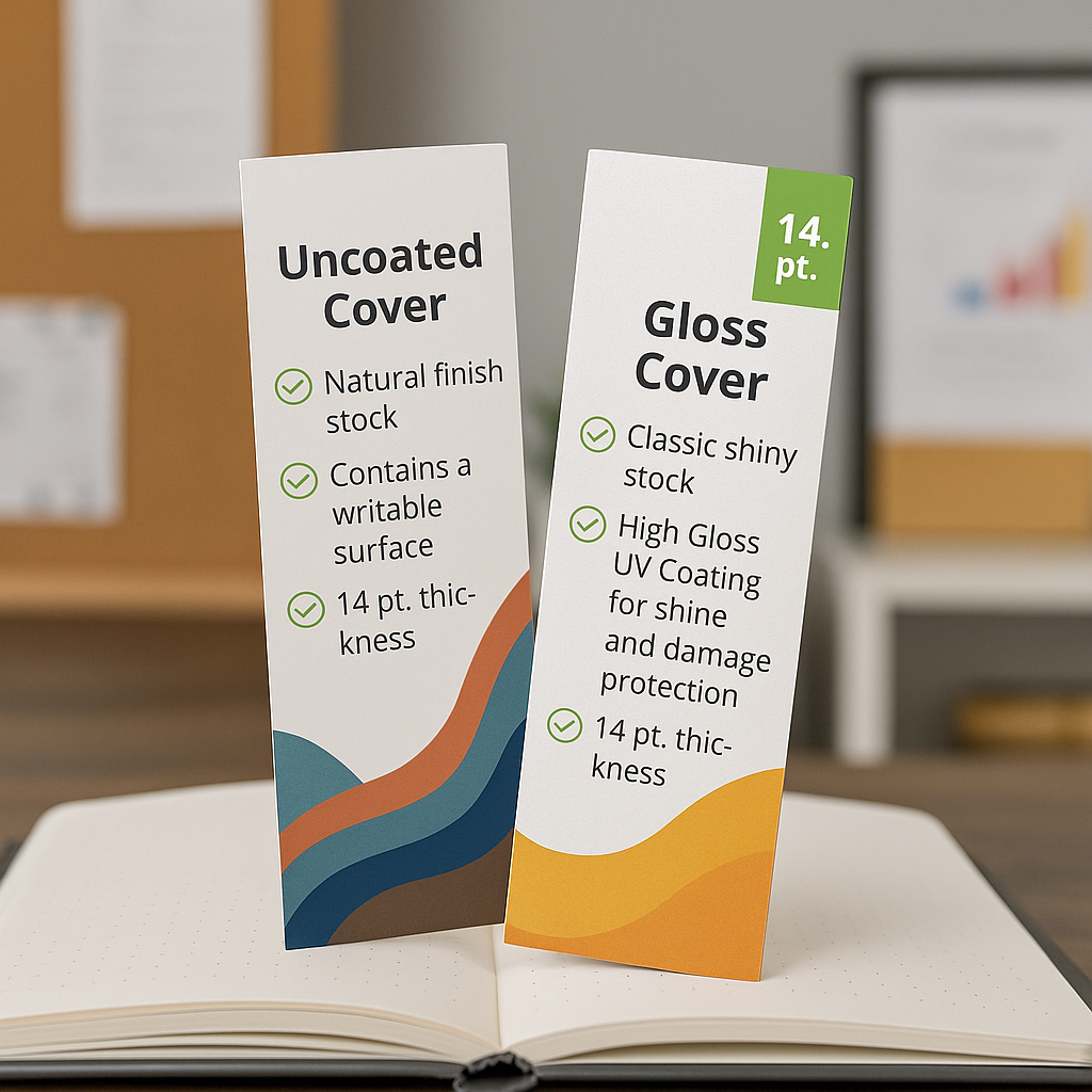 - Consider High Gloss UV Coating for durability, with options for writing/printing.